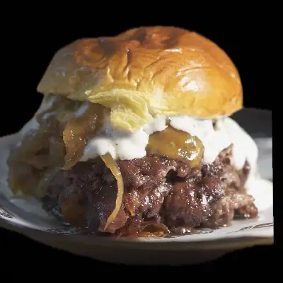 Dos bolas de 90gr Smasheadas con mucha cebolla infiltrada a la plancha, doble queso cheddar,y ketchup de pepinillos