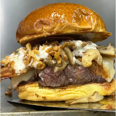 180gr Carne Vaca Rubia Gallega Madurada, Doble Cheddar, Doble Bacon, Cebolla Caramelizada y Salsa Jou